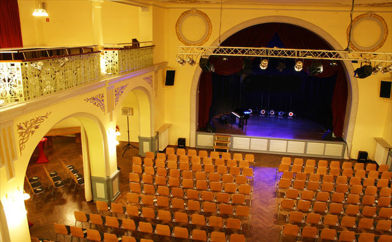 Ein großzügiges Foyer für Empfänge, ein Seminar- und Schulungsraum sowie der beeindruckende Saal mit Bühne und umlaufender Empore bieten vielseitige Möglichkeiten für Veranstaltungen unterschiedlichster Art.